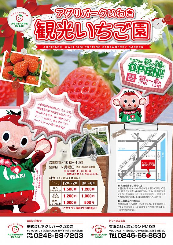 いわき市にある「アグリパークいわき観光いちご園」では、12月20日からとちおとめや章姫、紅ぽっぺなどのいちご狩りが体験できます。培地は2段の溶液栽培となっており、上段は大人の方が腰をかがむことなく採れる高さで、下段は子どもでも採りやすい高さとなっています。10時から16時まで時間制限なく体験でき、車イスやベビーカーでもゆっくり楽しむことができますので、ぜひご家族連れで足をお運びください。