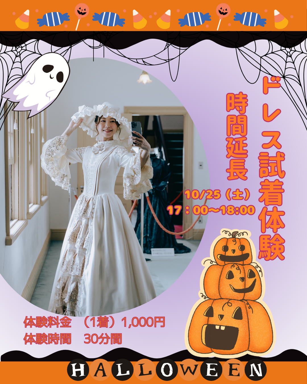 10月25日(土)は開館時間を19時まで延長して天鏡閣ライトアップイベントを行います。 さらに「明治風ドレス試着体験」は受付時間を18時まで延長。 ロイヤルティーはイベント限定スイーツの「かぼちゃのタルト」をご提供いたします。(10時~15時30分。830円。別途入館料) 年に一夜限りのライトアップをお楽しみください。 皆様のご来館をお待ちしております。