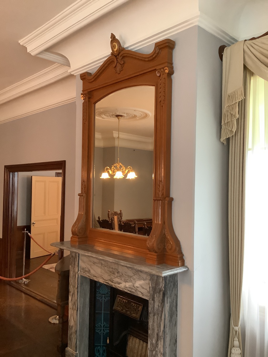 今朝は外気温、-6℃。積雪は約10㎝です。 今回は食堂の見所ポイントのご紹介♪ 食堂の家具はジャコビアン様式。 背高椅子(ハイバックチェアー)に座り、背筋を伸ばして食事をとることが礼儀とされていたそうです。 暖炉の上の鏡。額縁の上に有栖川宮家の紋章「三菊紋」がデザインされています。 4月~11月の期間は、ティールームとして開放していますので、ティータイムを楽しみながら家具や装飾も近くでご覧いただけます。 雪解けが待ち遠しいですね♪ ご来館をお待ちしております。