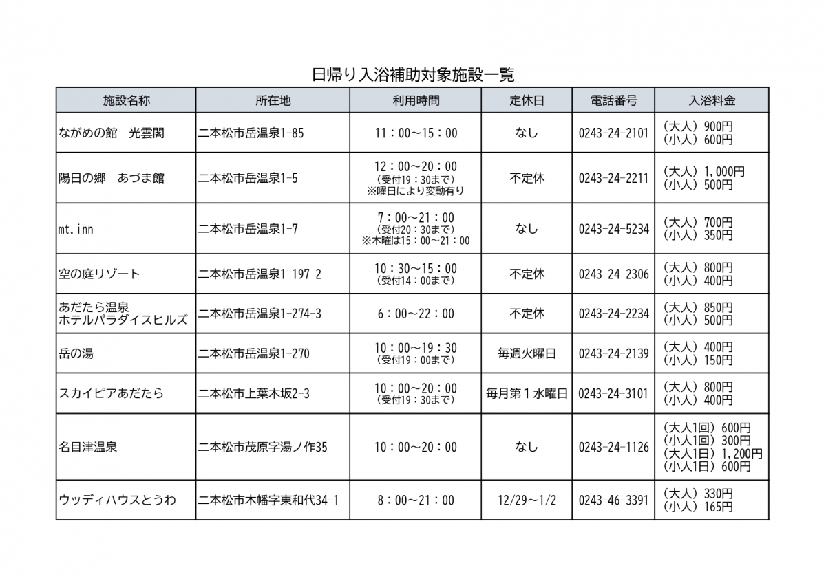 二本松市合併20周年記念事業「日帰り入浴補助」