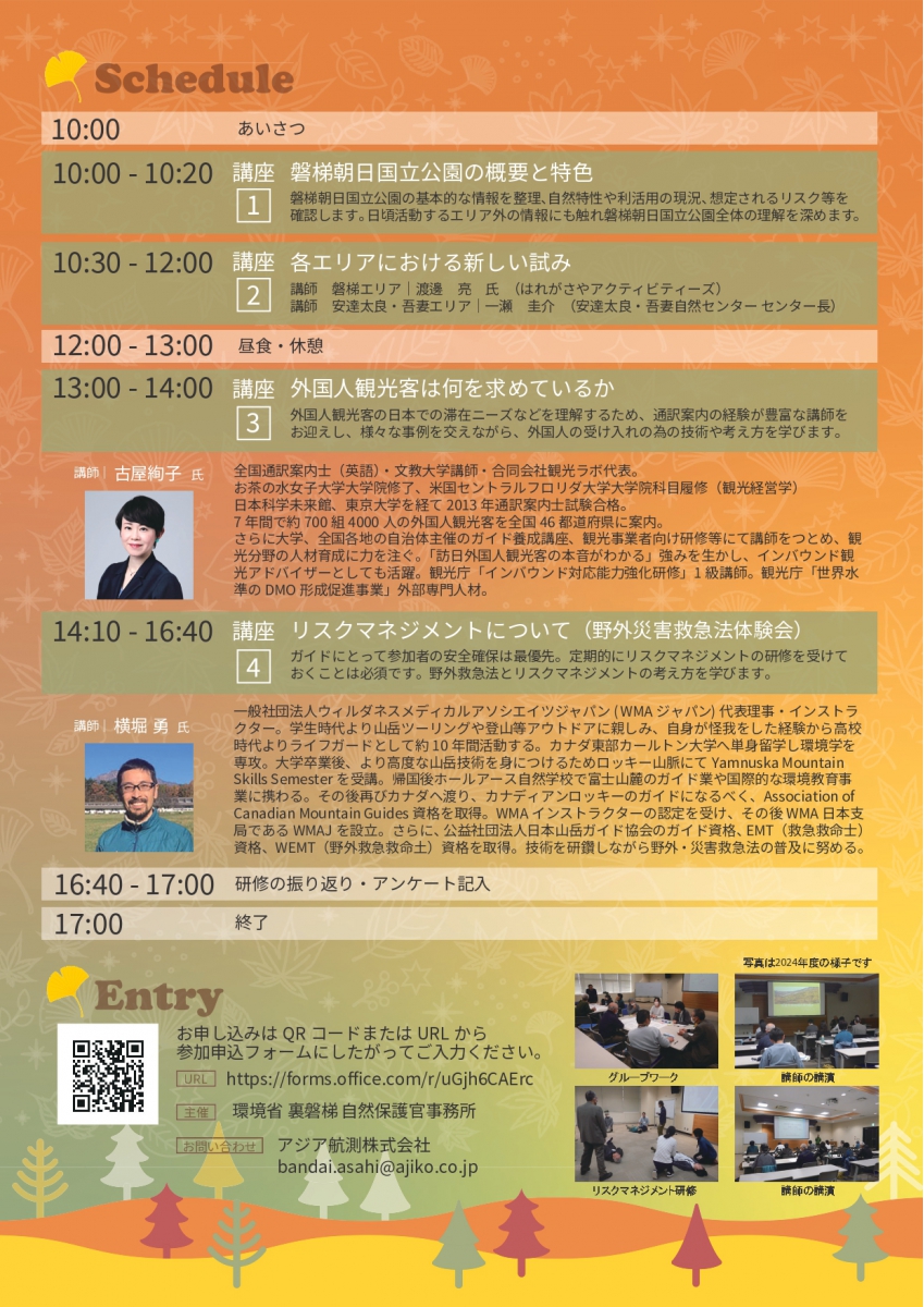 国内外で活躍する専門家や地域の実践者を講師としてお迎えし、国立公園内の概要やインバウンドの動向、ガイドに求められるリスクマネジメントなどの情報や知識を得る機会となっております