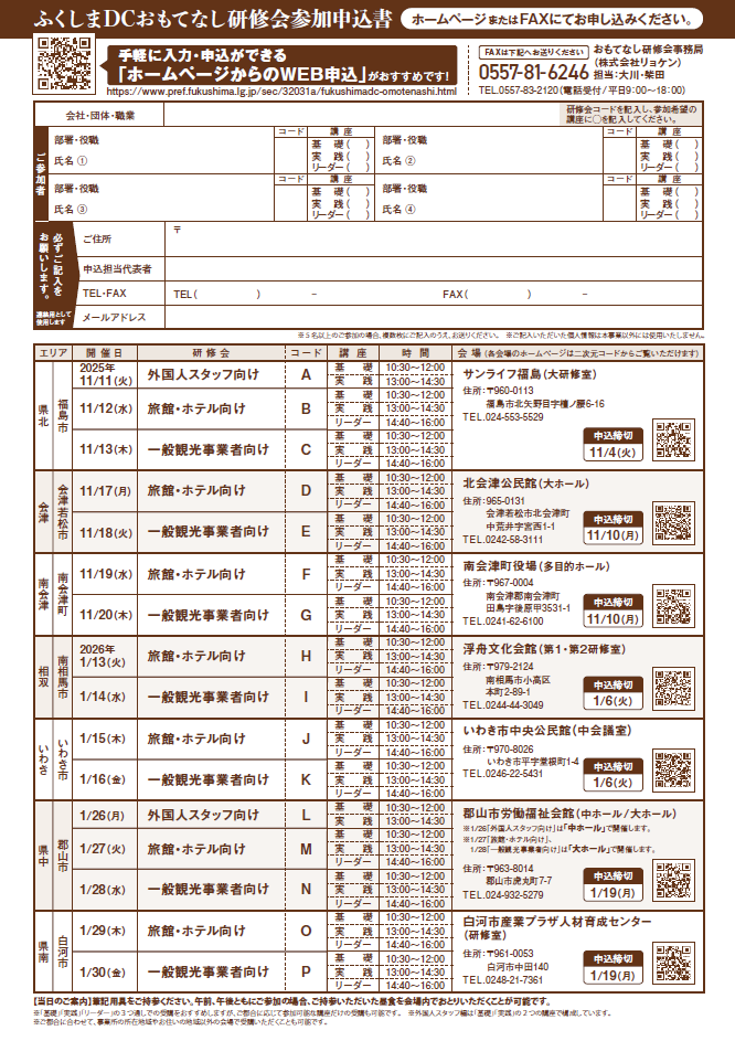 2026年4月~6月に福島県で開催される「ふくしまデスティネーションキャンペーン(ふくしまDC)」の開催に向けて、本県を訪れるお客様に「福島に来て良かった」「福島にまた来たい」と思っていただけるよう、宿泊施設や観光事業者の方々向けに「おもてなし研修会」を開催します。