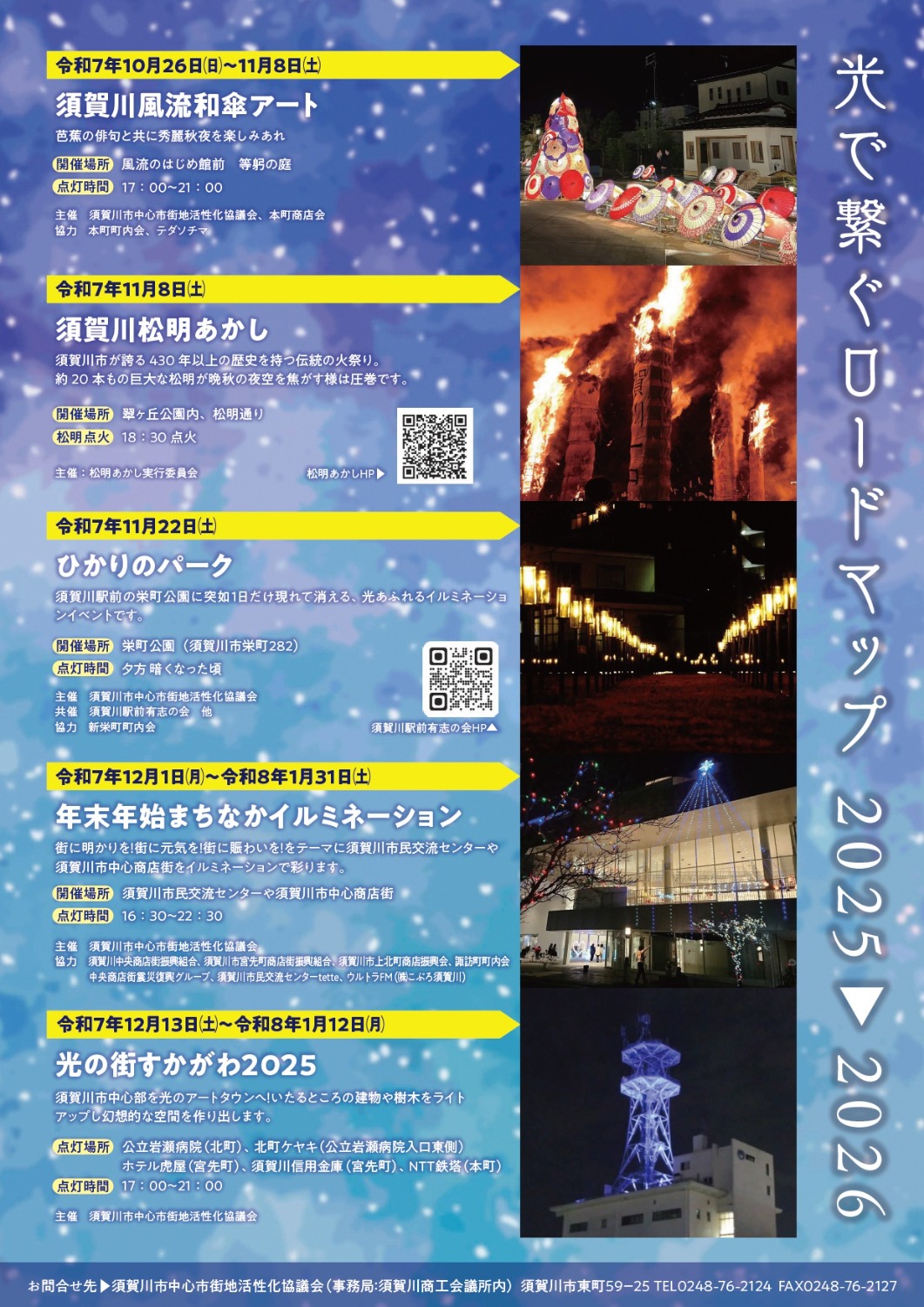 年末年始まちなかイルミネーション【光の街すかがわ2025】 県中 須賀川市 【特集】イルミネーション 夜を楽しむ 2025.12.01(月)~2026.01.31(土) 街に明かりを!街に元気を!街に賑わいを! 賀川市民交流センターや須賀川市中心市街地をイルミネーションで彩ります。【点灯時間】16:30~22:30 開催地 須賀川市民交流センター及び須賀川市中心商店街 お問い合わせ 須賀川市中心市街地活性化協議会(須賀川商工会議所) TEL:0248-76-2124 シェアする ポスト
