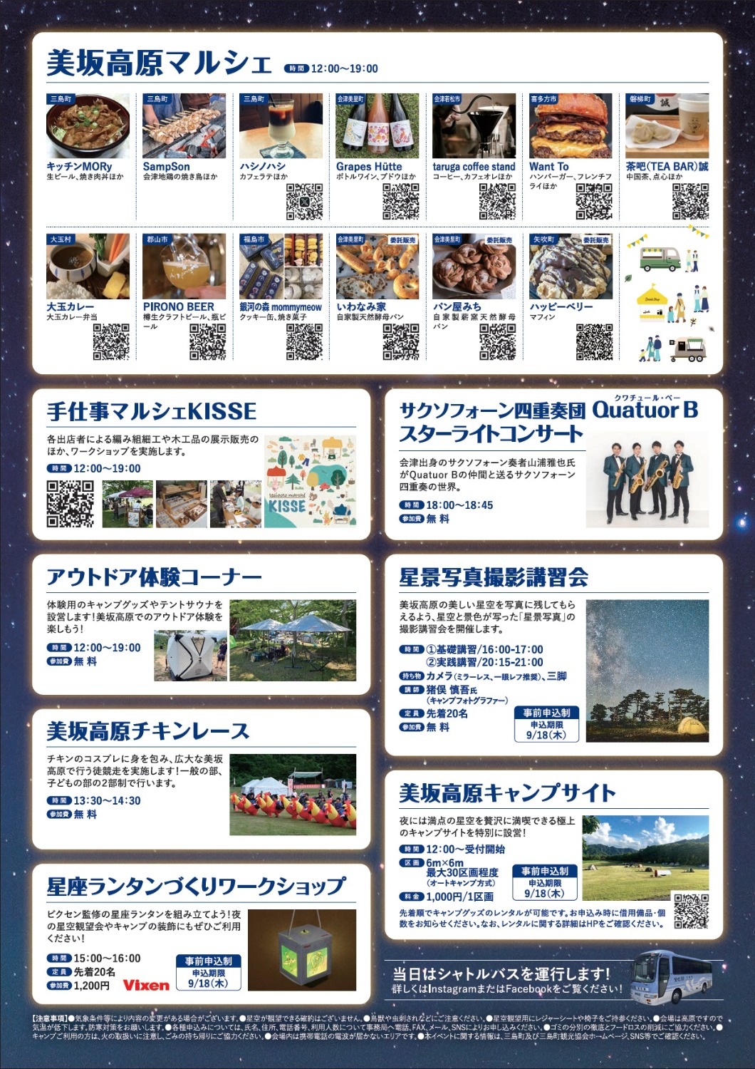 国立天文台上席教授の渡部潤一先生による講演会や星空観望会、会津出身のサクソフォンプレイヤー山浦雅也さんによるスターライトコンサートのほか、日中はマルシェでグルメやお買い物を楽しんだり、ワークショップに参加したり、壮大な高原での運動会など、美坂高原を満喫できるイベント盛りだくさんです。イベント限定でキャンプサイトも開設します。