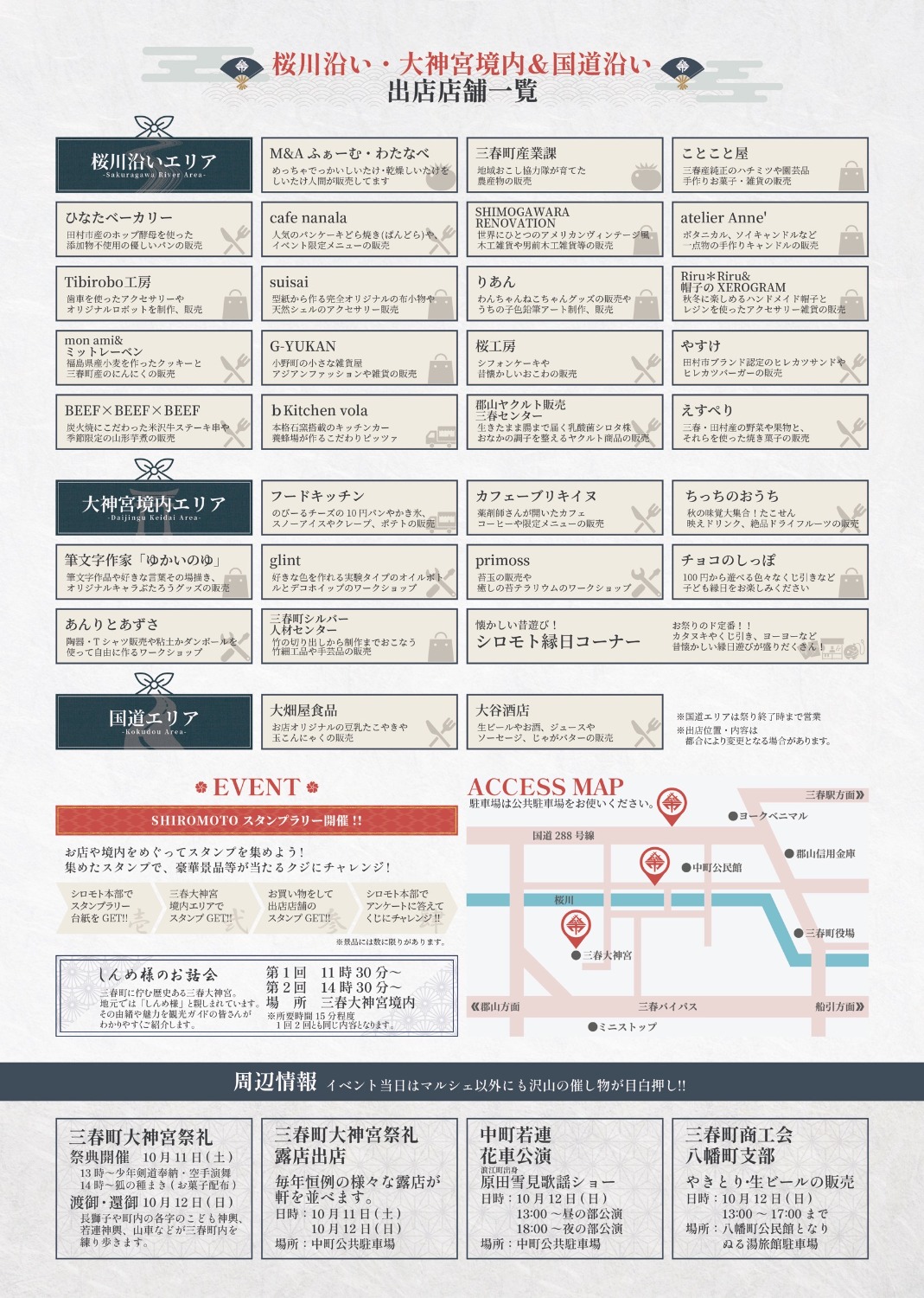 三春町で行われる「三春大神宮秋季例大祭」と同日開催で、三春シロモト市(マルシェ)を開催します。