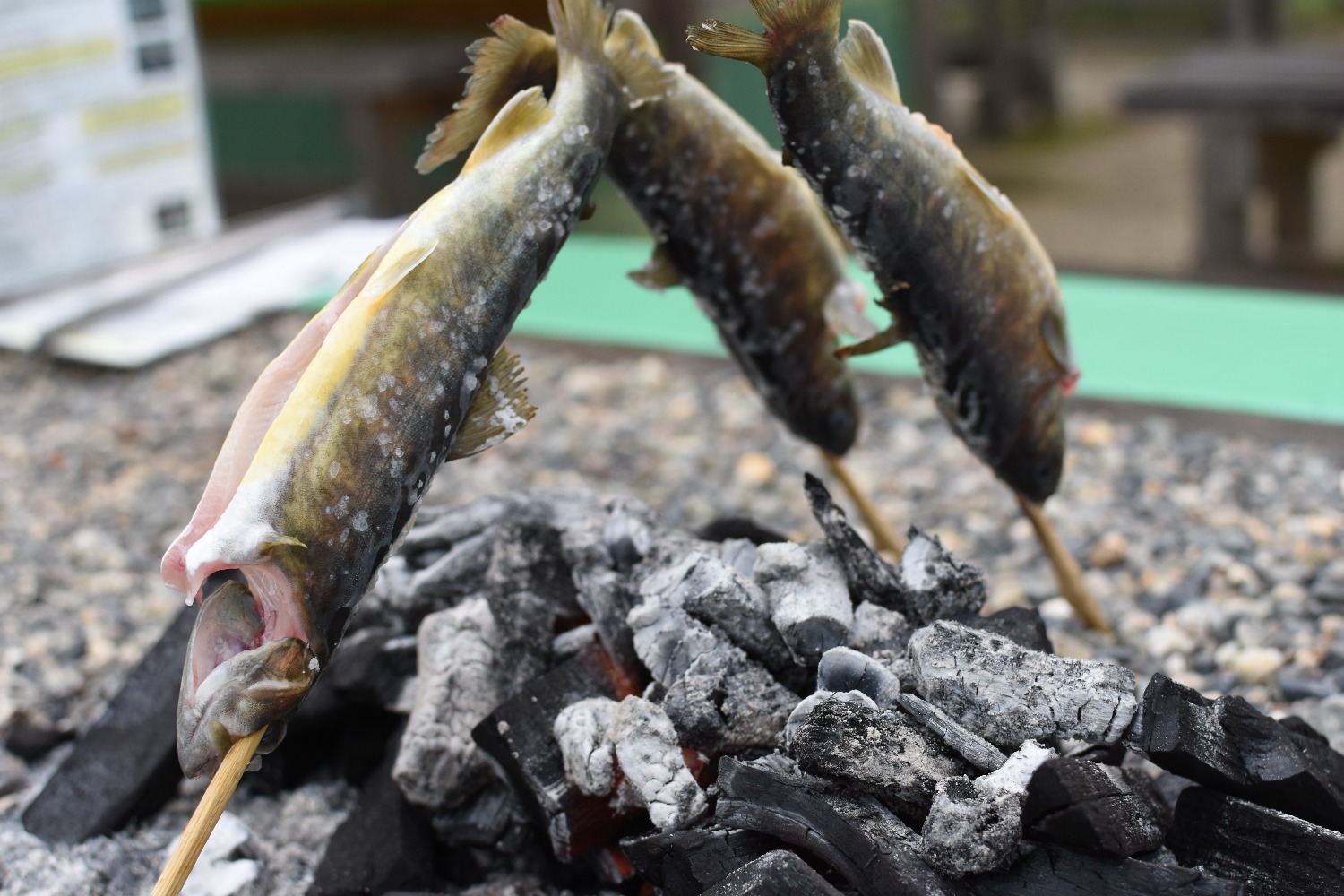 大自然に囲まれた清流の水で育ったイワナ釣りが体験できます。自分で釣ったイワナを串にさして炭火焼に。また、から揚げ、刺身で食べるイワナはおいしいこと間違いないです。春には遅咲きの桜も見られるかもしれません。
