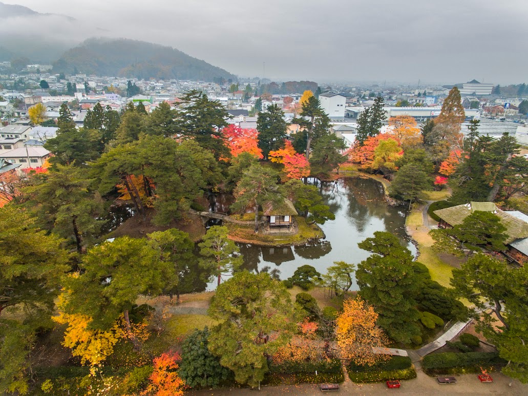 鶴ヶ城の東、徒歩約15分の場所にあり、中央に心字の池を配した回遊式の借景園と、各種薬草を栽培する薬草園が御薬園の名前の由来です。