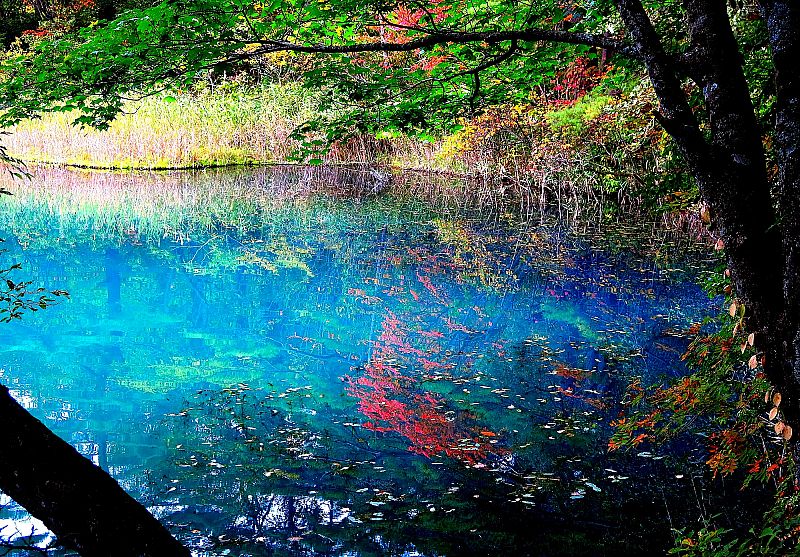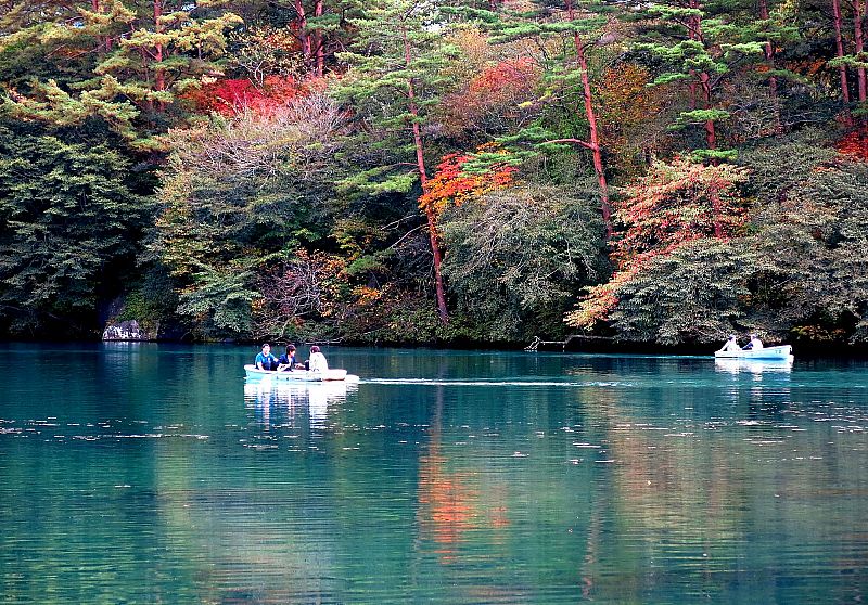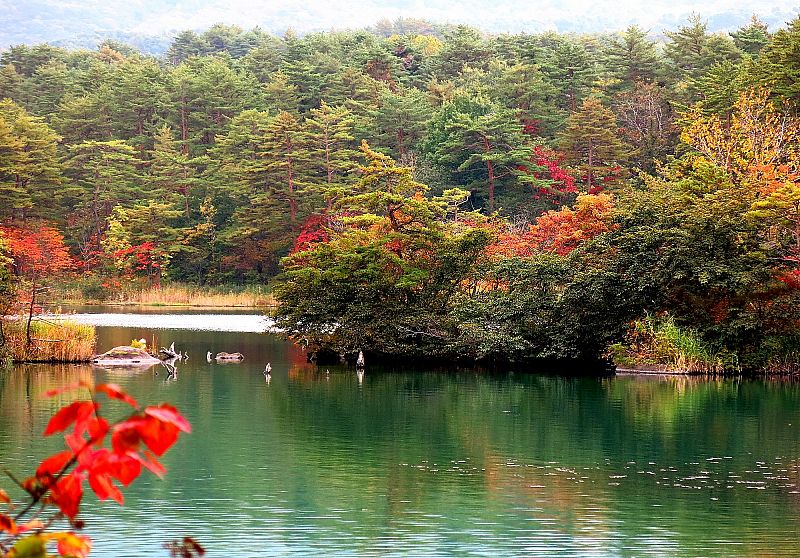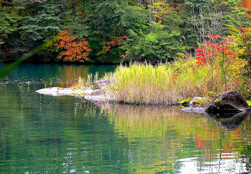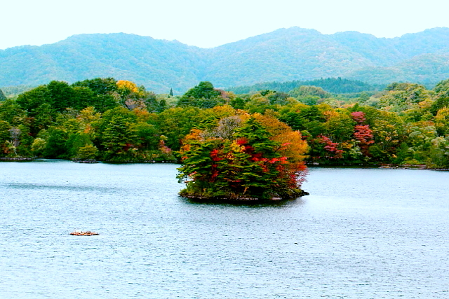 裏磐梯 小野川湖に浮かぶ島の紅葉