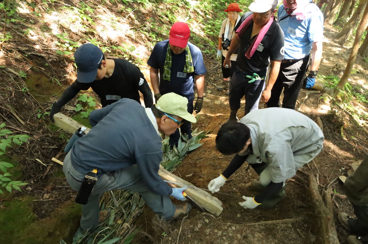 9月1日(月)、「飯豊朝日を愛する会」草刈氏、清水氏を講師に招き、「ほんとの空ツーリズム」関係者17名で、 烏川橋~旧道間の登山道保全作業を行いました。