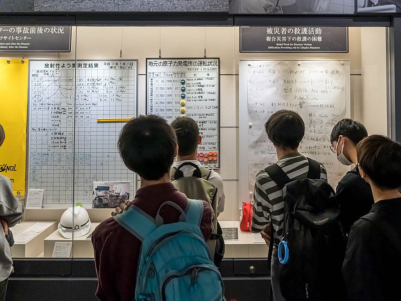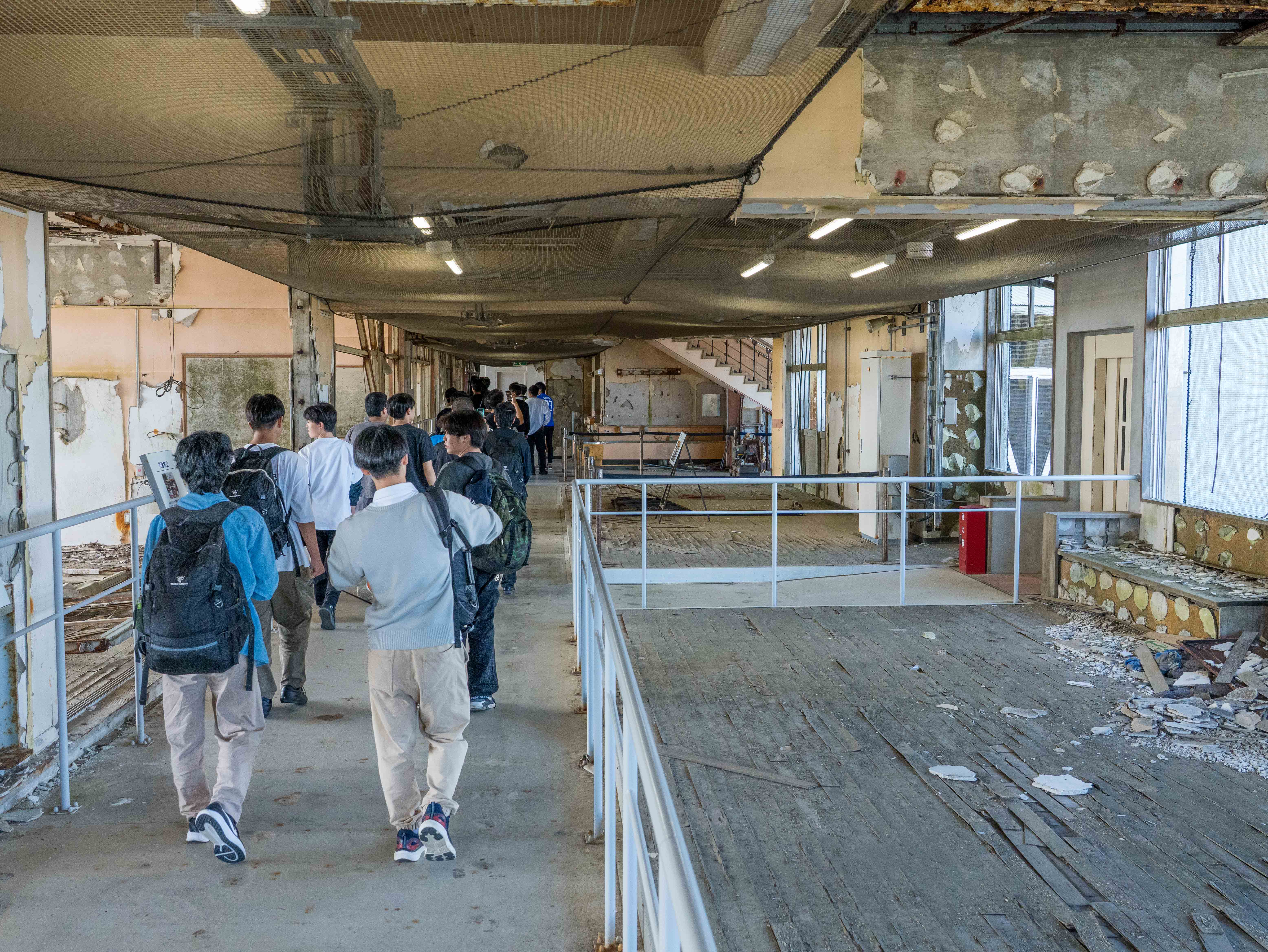 最初に訪れた伝承館では、プロローグシアターで震災と原発事故についての映像を視聴し、生徒たちは真剣な表情で見つめていました。上映後は2階の展示ブースに移動し、スタッフによる館内の概要説明を受け、震災や原発事故の経緯、避難の様子などについて理解を深めました。その後の自由見学では、展示資料や映像をひとつひとつ丁寧に見ながら、原発事故がどのように発生したのか、人々がどのように避難したのかを学び取る姿が見られました。