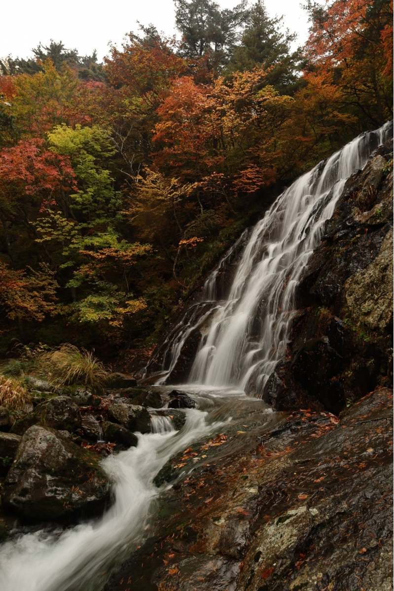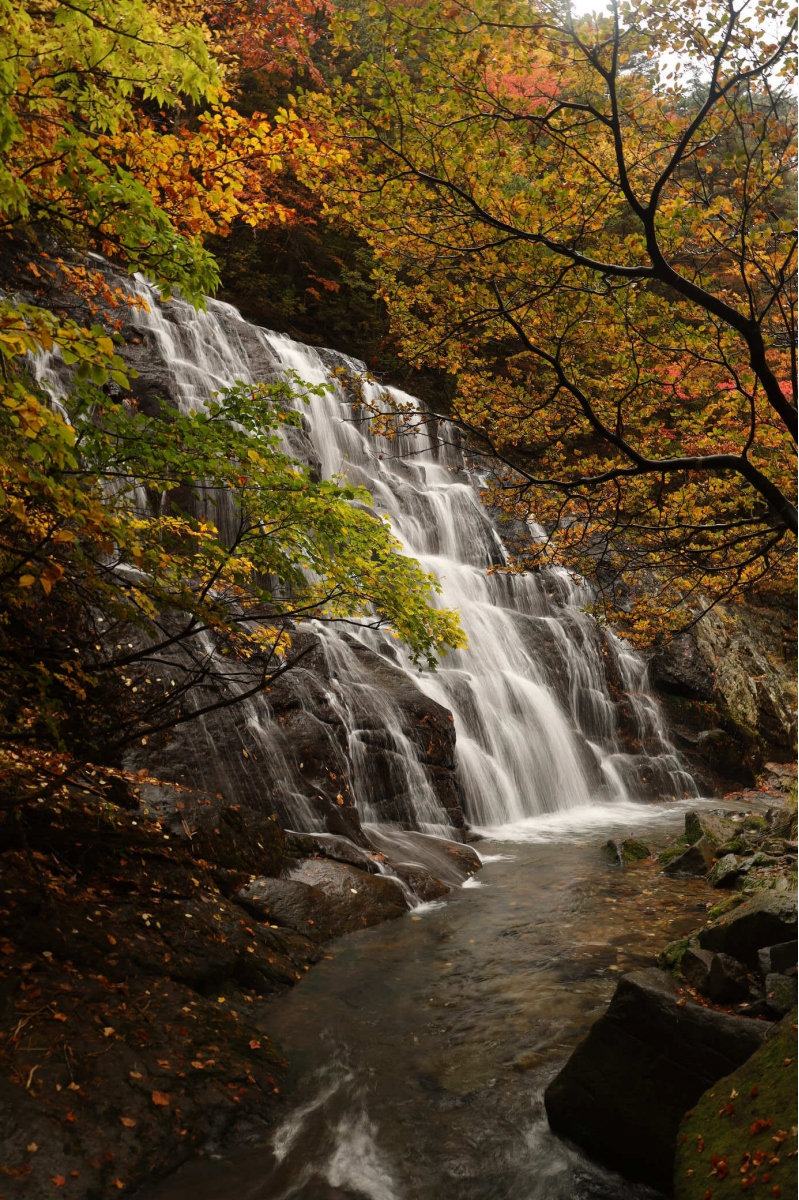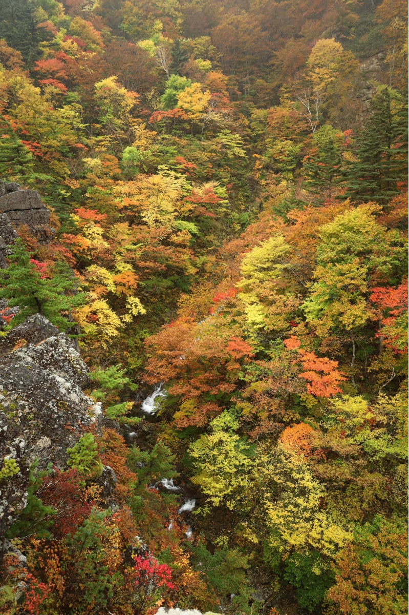 安達太良山への登山口のひとつ、塩沢登山口から1時間程歩くと現れる「屛風岩」と「八幡滝」 紅葉の見頃を迎えています (10月25日撮影)