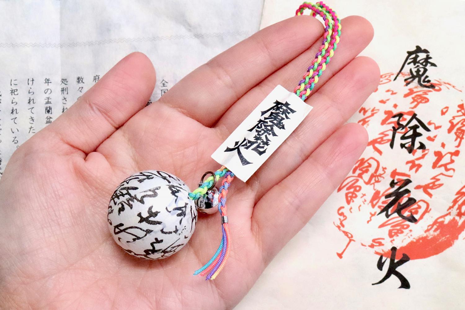 花火の里として知られる浅川町では、魔除けや縁起物として花火の殻を軒下につるす風習がありました。この「魔除花火」のミニ版として近年登場したのが「身に魔除花火(みにまよけはなび)」です。商工会の職員や会員が紐を編んだり古文書を貼り付けたりして手作りしています。お守りとしてカバンやスマホに付けるのにぴったり!
