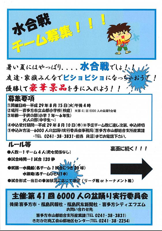 お知らせ蔵のまち喜多方夏祭り水合戦チーム募集!!