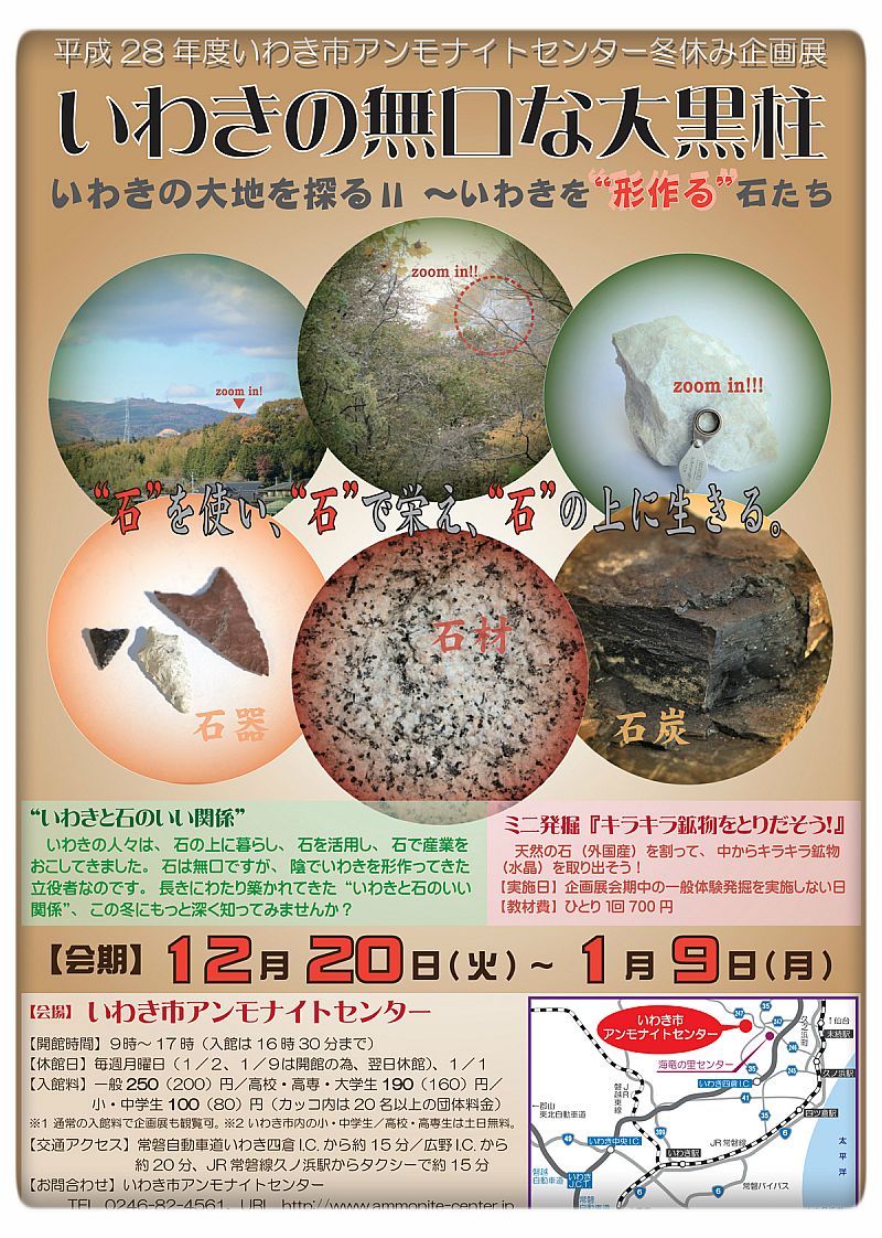 特集レポートいわき市アンモナイトセンター 冬休み企画展「いわきの無口な大黒柱 いわきの大地を探るⅡ いわきを“形作る”石たち」開催中! [平成28年12月30日(金)更新]