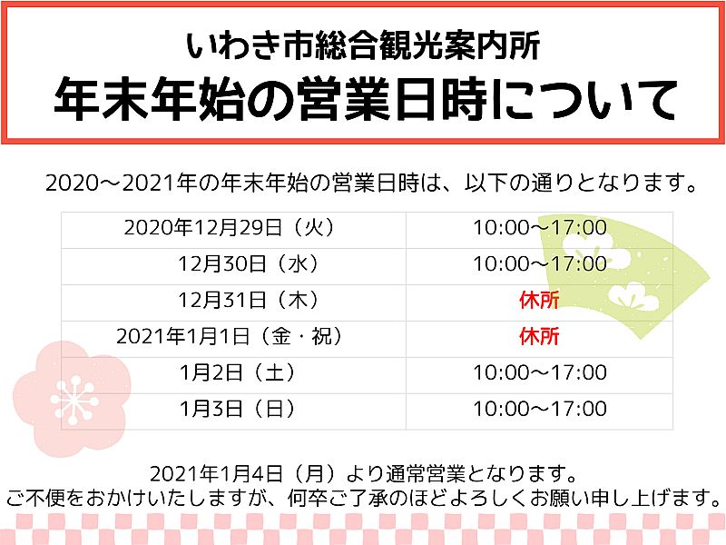 特集レポートいわき市総合観光案内所 年末年始の営業日時について