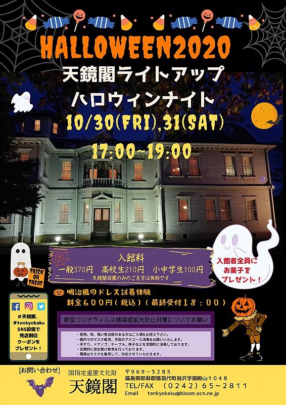 お知らせ【10月30日(金)・31日(土)】天鏡閣ライトアップ ハロウィンナイト