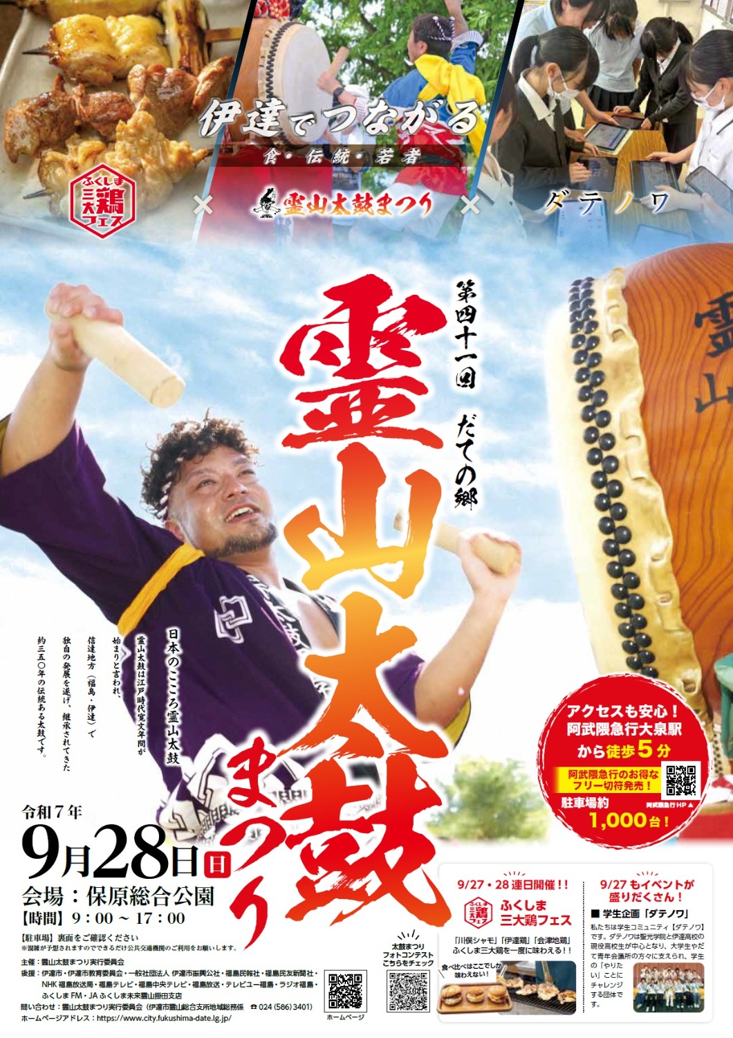 霊山太鼓演奏の他、ステージショーや友好交流都市のPR等を行います。また、前日から同会場で開催される「ふくしま三大鶏フェス」の飲食ブースも出店しています。