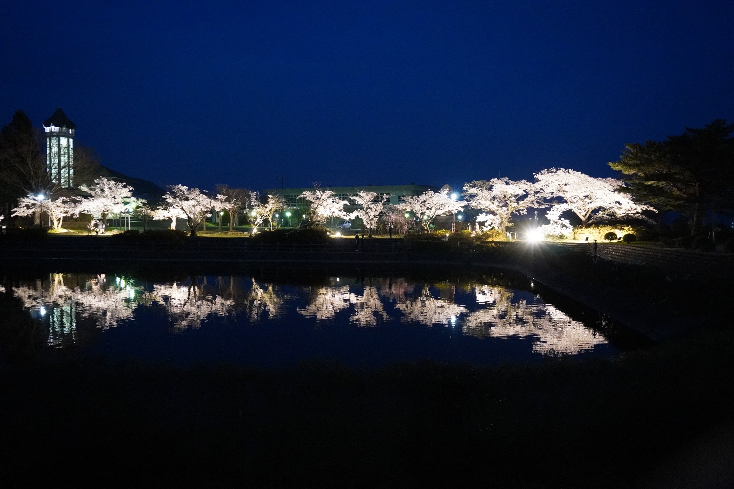 観月台公園で開催される桜まつりでは、約100本のソメイヨシノが華やかに咲き誇り、夜には桜並木が鮮やかにライトアップされ春の雰囲気を演出します。