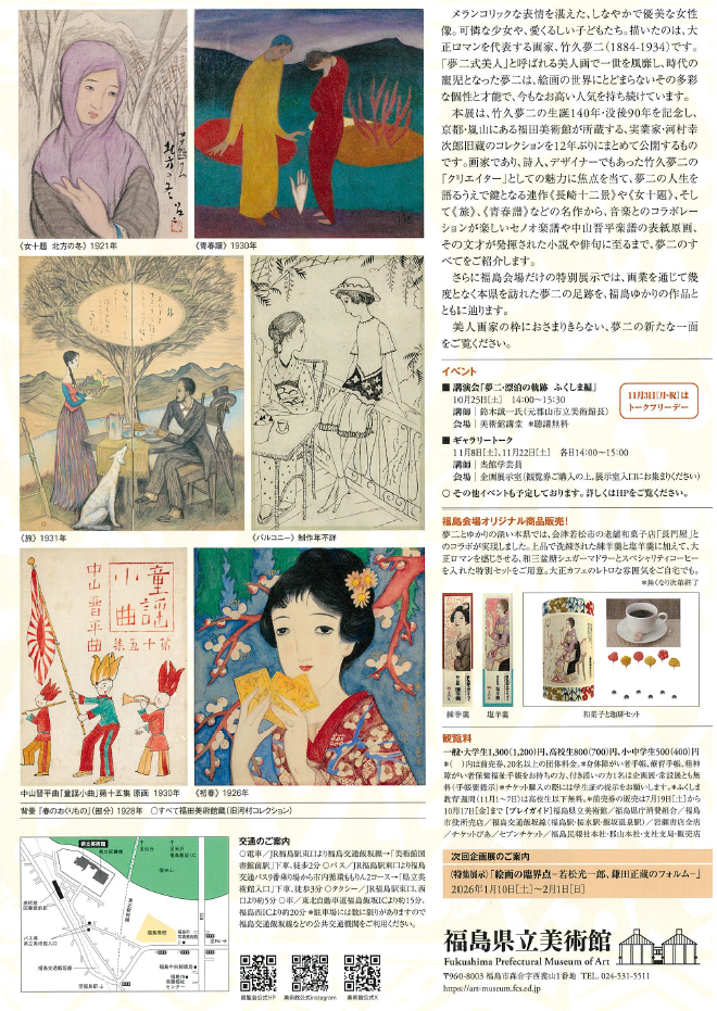 さらに福島会場だけの特別展示では、画業を通じて幾度となく本県を訪れた夢二の足跡を、福島ゆかりの作品とともに辿ります。