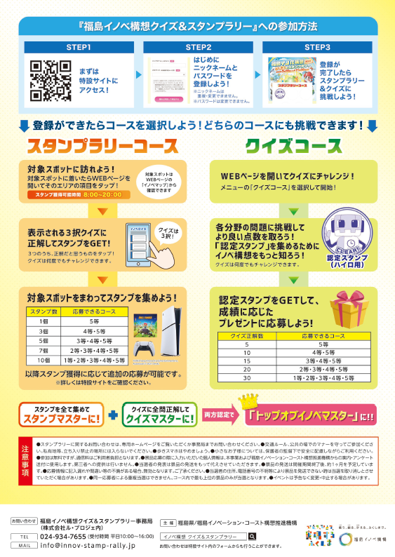 ②コースは浜通り等15市町村を巡るスタンプラリーコースと、その場で参加できるクイズコースの2つ。どちらも福島イノベーション・コースト構想や対象地域に関するクイズに正解することでスタンプを獲得できます。