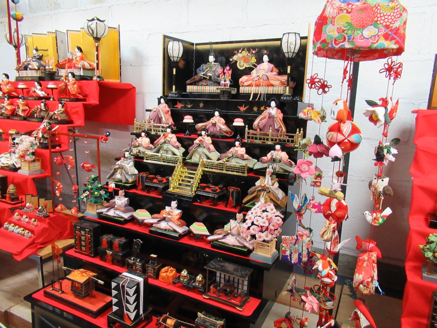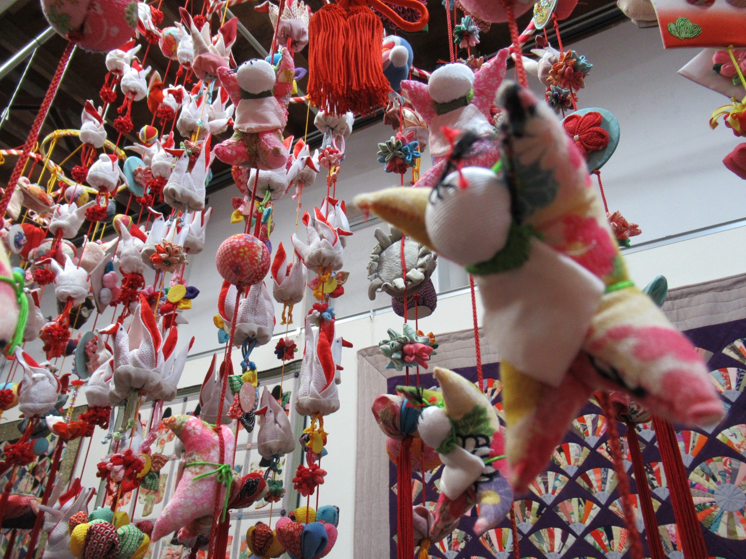 野馬追通り銘醸館では、蔵の中につるし雛手芸教室で作成した作品を展示しています。そのほか、昭和初期の七段飾りのお雛さまやパッチワークの夕ペストリーも壁面に飾られ、雛飾りとの豪華な競演が楽しめます。