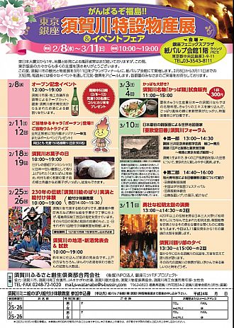 東京銀座紙パルプ会館内に「須賀川特設物産展」を開設します。須賀川の美味いもん、郷土文化をたっぷり味わう充実の33日間です。皆様のお越しをお待ちしています。