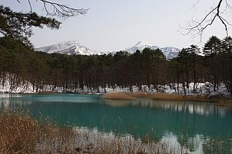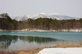 弁天沼と西大巓。風が吹くと青くなり、風が止むと緑になります。水面が波立つことで反射が変わり、そんなふうに見えるようです。