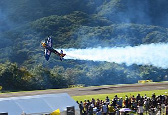 競技会には、県内はもとより、北は岩手県、南は福岡県まで多くの来場者があり、年々来場者が増えているとのことです。観客は、アジア第一人者の室屋氏のフライトを間近で体感し、大人から子供まで大いに楽しみました。