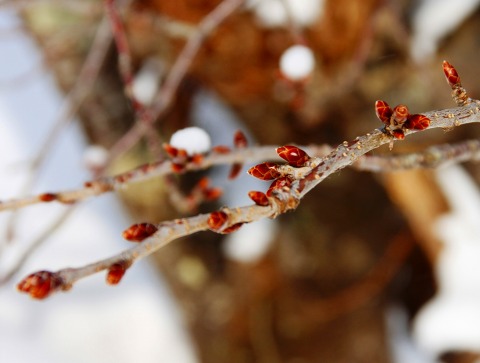 ウリハダカエデの芽も心なしか膨らんできたように思います。カンボクやツルウメモドキの赤い実がほぼ鳥たちに食べられてしまったので、こんどは冬芽の赤みが目立ってきました。