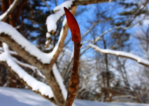 オオヤマザクラの冬芽。裏磐梯周辺では、毎年5月のはじめ頃から開花が始まります。