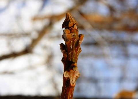 オニグルミの冬芽。さるの顔やひつじの顔に見えると言われる葉痕が特徴的です。