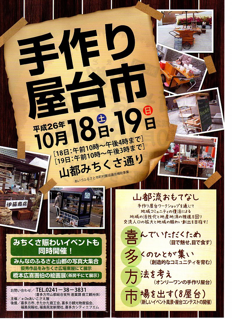 山都町内から7店舗、千葉県から1店舗の出店によるそば長屋方式で実施します。また、町内の団体等が手作りした屋台を使用して特産品などを販売する屋台市、手作り屋台コンテストを同時開催します。19日は喜多方レトロ横丁でお馴染みのちんどん屋がやってきます。