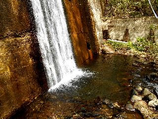 ダム湖に流れ込む沢を遡上すると、わずか50メートルで現れる魚止の砂防堰堤。堰堤上流は平成初めの台風水害で沢が抜けてしまい、魚影は無くなってしまっている。何度か上流に種魚を上げてみたが、ゴーロが砂で埋まっており定着はしなかった。沢は一跨ぎできるほど小さい。