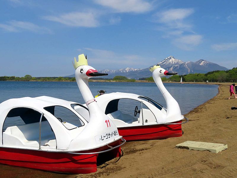 小坂トンネルを抜けると、松林に囲まれた志田浜があります。浜辺には、子供でも漕ぐことができる足漕ぎボートが人気です。湖畔には、行列ができる美味しいアイスクリーム店が軒を並べて、会津のお土産も全て揃います。