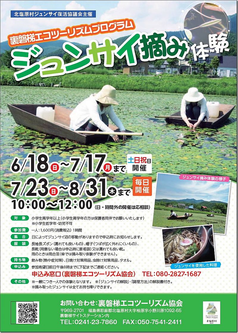 夏の風物詩、裏磐梯のジュンサイ摘み体験が始まりました。旬のトゥルントゥルンの食感をお楽しみください。摘み取ったジュンサイは全てお持ち帰りいただけます。詳しくは裏磐梯エコツーリズム協会HPをご覧下さい。