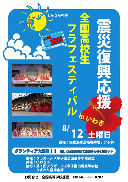 8月12日(土)に四倉海水浴場特設ステージで「震災復興応援・全国高校生フラフェスティバル in いわき」が行われます。