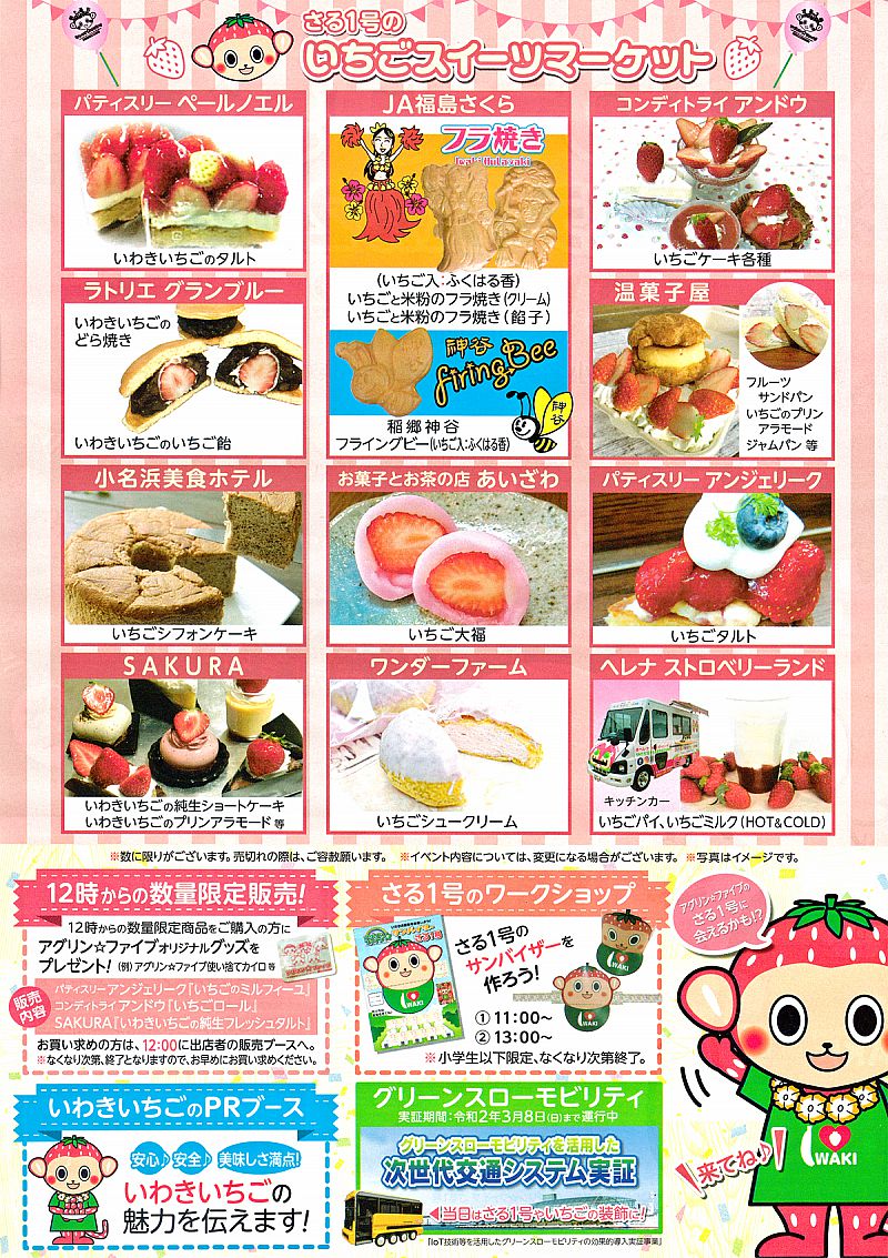 いわき産いちごを使ったスイーツが並ぶ「さる1号のいちごスイーツマーケット」では、市内11店舗が参加。