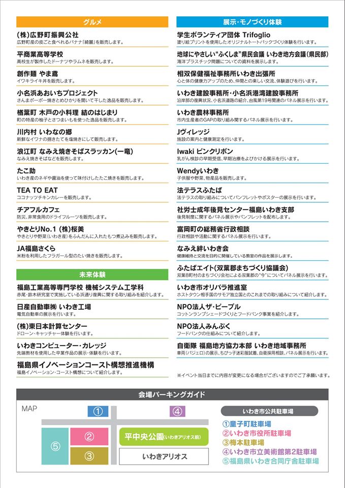 また、福島県の未来を体験できるドローンやロボットの操作など最新テクノロジーに触れることができるほか、いわき地域と双葉地域で活動する様々な団体による取り組みをパネル等で展示・紹介します。