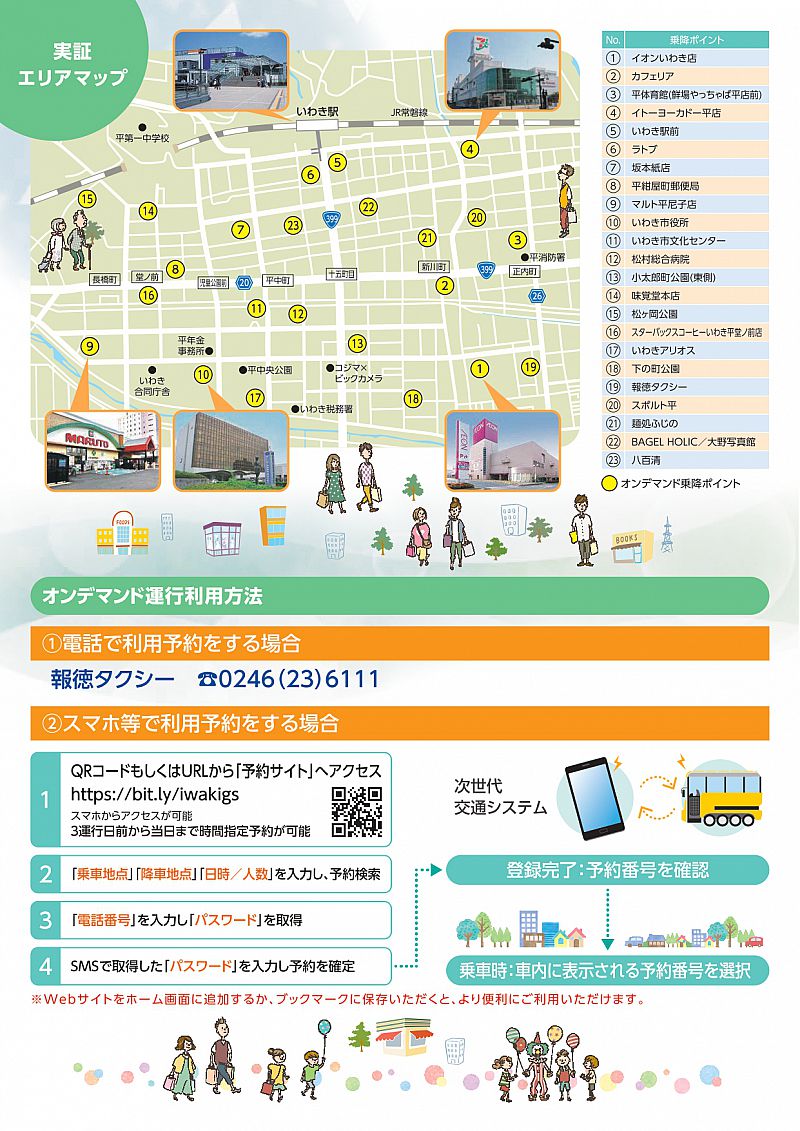 JRいわき駅周辺23箇所に乗降ポイントを設け、電話・スマートフォンなどの予約に応じて運行いたします。