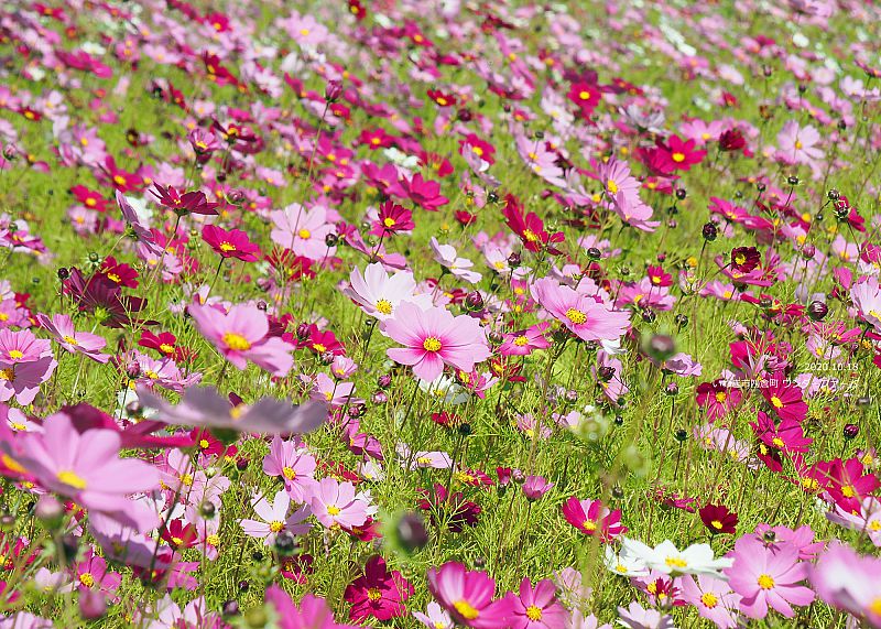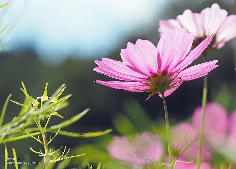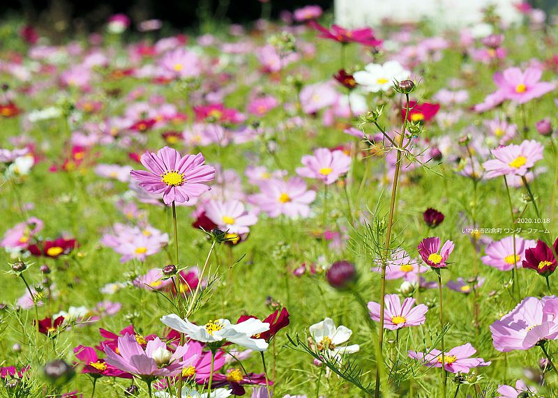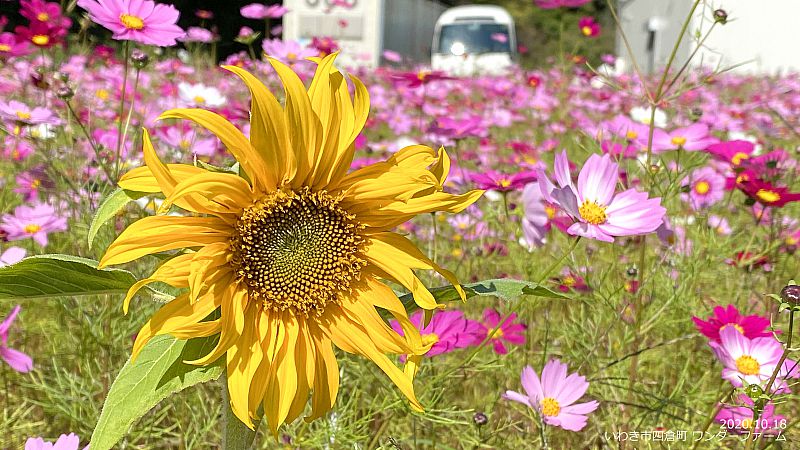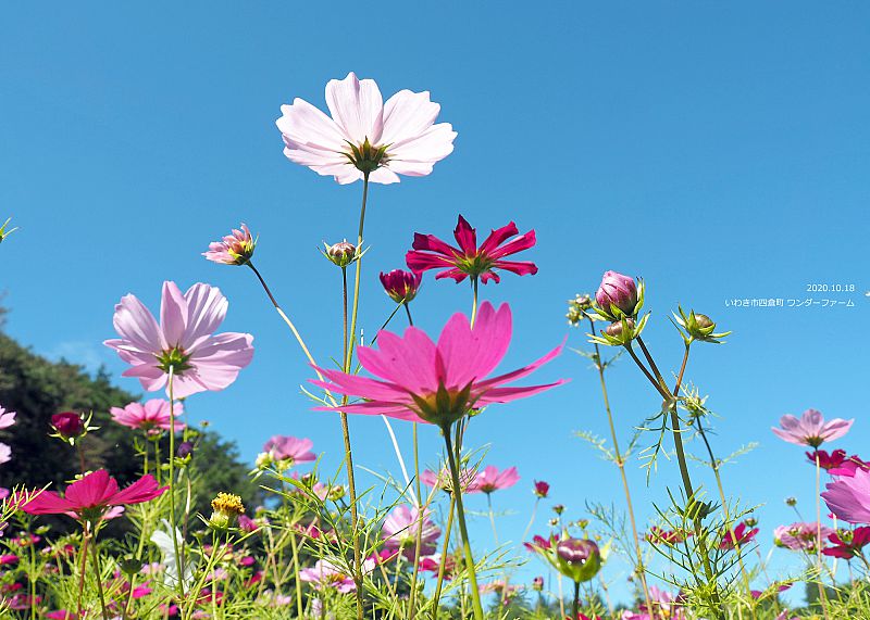 いわき市四倉町のワンダーファームでは、コスモスが現在見頃を迎えております。青空の下でピンクや赤、白の花びらが風に揺れ、美しい景色を堪能できます。