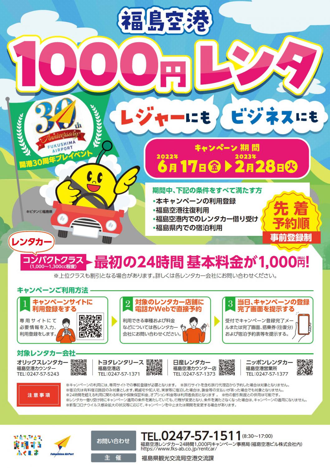 さらに、福島空港からお得にレンタカーを利用できる「1000円レンタ」も実施中!キャンペーンへの事前登録、福島空港往復利用、空港内でのレンタカー借り受け、福島県内での宿泊利用の4つの条件を満たせば、レンタカーを最初の24時間、基本料金税込み1,000円でご利用いただけます。