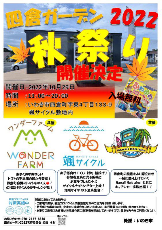 四倉町の颯サイクルにて、「四倉ガーデン2022 秋祭り」を開催いたします。