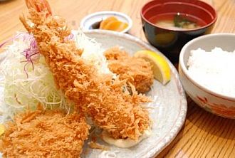 海老フライとヒレかつが2つ、ごはんと味噌汁にお漬物が付いて1,360円です。