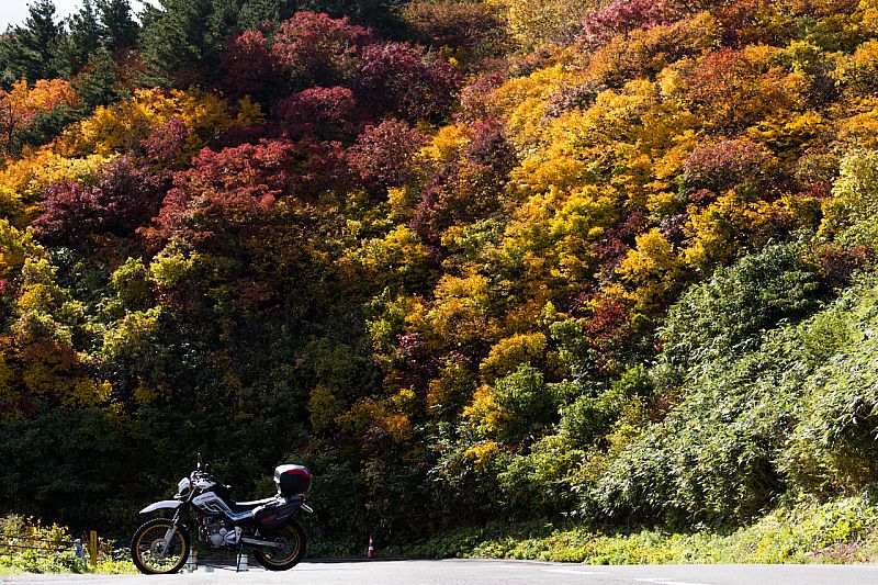 晩秋の磐梯吾妻レークライン三湖パラダイスよりバイクと共に湖を望む