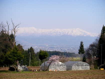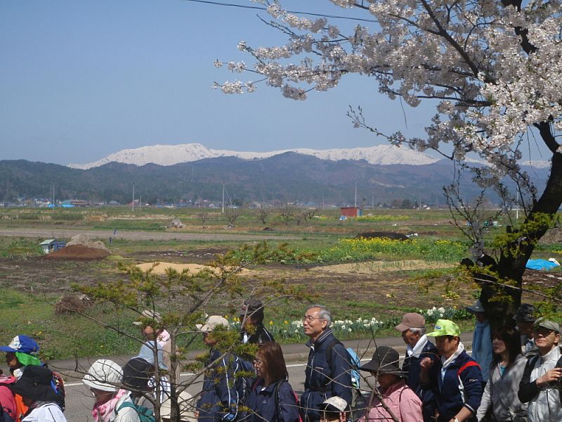 桜と飯豊の雪渓と(喜多方市桜ウォーク)