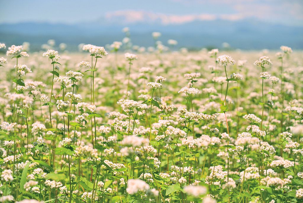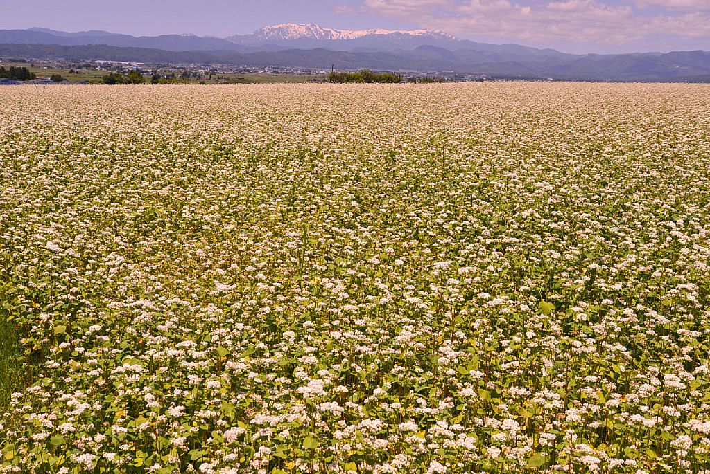 蕎麦畑に霞む飯豊山