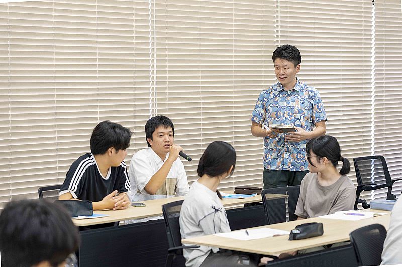 教育子どもコースは、はじめにCREVAおおくまにて大熊町を拠点に日本の子どもたちが海外の人と交流する教育事業を手がける、in the Rye 株式会社の沖野昇平代表取締役との対話を行いました。沖野さんからは、大熊町における教育の現状や、義務教育学校大熊町立学び舎ゆめの森の特色について紹介がありました。年齢や学年の枠を超えて子どもたちが共に学ぶこと、時間割に縛られない自由な授業形態、外国人との交流プログラムなど、従来の学校像とは異なる取り組みに、生徒たちは話を聞きながら熱心にメモを取り、沖野さんの問いかけに自分の意見を返していました。