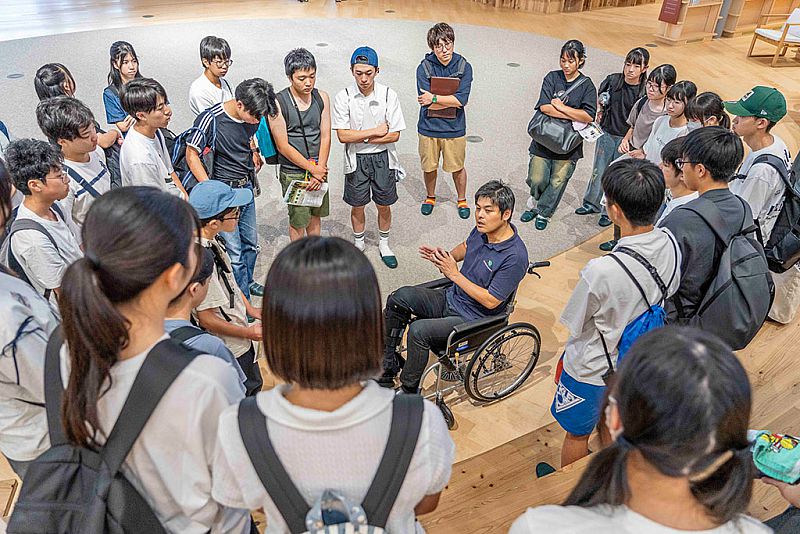 続いて訪問した学び舎ゆめの森では、南郷市平校長から学校の理念や子どもたちの様子について説明を受け、校舎を見学しました。学年ごとの教室が存在せず、校内のさまざまな場所で子どもたちが自ら学べることや、全学年が一緒に給食をとるランチルームの光景に触れた生徒たちは、「こんな学校に通ってみたい」と口々に語り、学びの多様性に驚いている様子でした。
