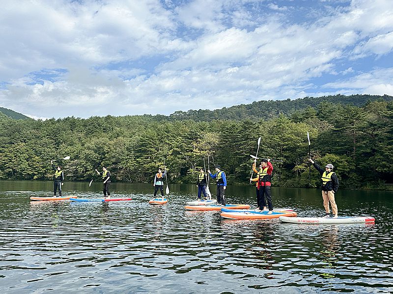 2日目、朝食後は土湯温泉からほど近い女沼でのSUP体験へ向かいました。インストラクターの方からSUPの道具の説明と、乗り方のレクチャーを受けた後、SUP体験がスタート。ほぼ皆さんが初めての体験だったようですが、日頃から登山トレーニングを行っていることもあり、バランス感覚が抜群で乗りこなしていました。