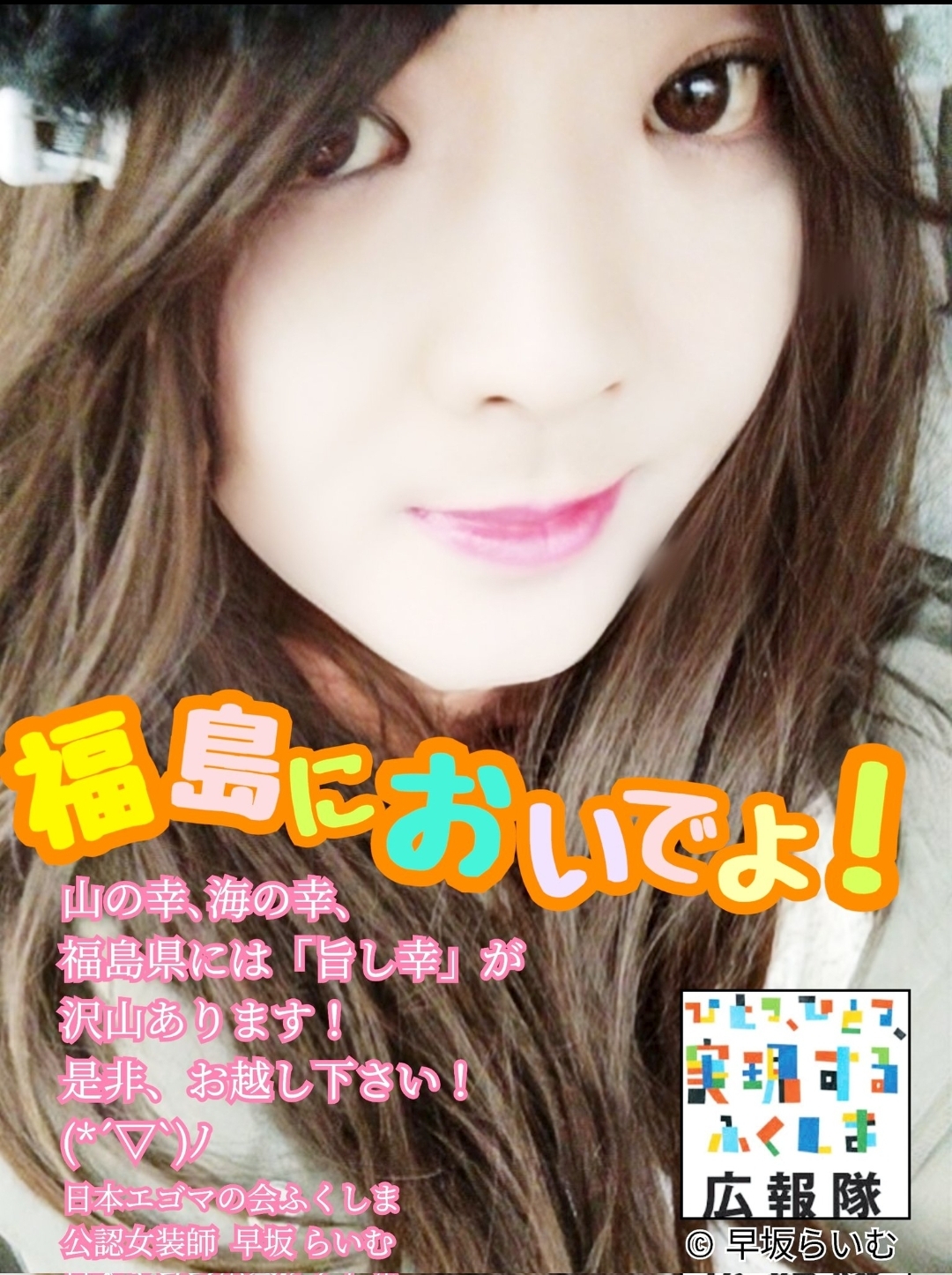 - ふくしまに来て、富岡町に住んで、山菜や魚貝類を食べて、畑で野菜作って、ふくしまの広報活動してます女装師【早坂らいむ】です。